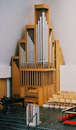 Bordun 16‘ Rohrflöte 8‘ Oktave 8‘ Viola da Gamba 8‘ Oktave 4‘ Spitzflöte 4‘ Quinte 2 2/3‘ Oktave 2‘ Terz 1 3/5‘ Mixtur IV Trompete 8‘ Tremulant |