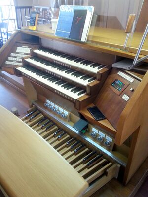 - ↑ Freies Koppelmanual mit der Möglichkeit, das Rückpositiv in 16'-, 8'- und 4'-Lage anzukoppeln; Darüber hinaus Nutzung als MIDI-Klaviatur