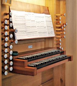 | Spielhilfen, Koppeln: | Koppeln II/I, II/I Sub, II/I Super, I/P, II/P; 1 freie Kombination, frei einstellbares automatisches Pianopedal, Tutti, Crescendowalze, Zungeneinzelabsteller |