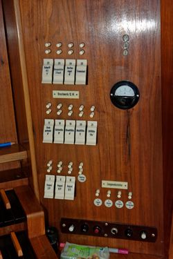 | Spielhilfen, Koppeln: | II/I, I/P, II/P; Jalousieschweller für II; 2 freie Kombinationen, Handregister zu den freien Kombinationen, Organo Pleno, Zungeneinzelabsteller |