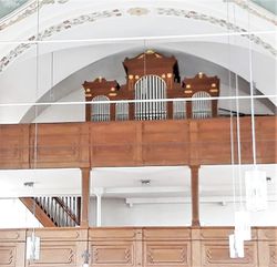 | Umbauten: | Die Orgel wurde zwischenzeitlich etwas umdisponiert. Der Bordun 16' im Hauptwerk wurde durch eine Quinte 11/3 ersetzt, der Salicional 8' im II. Manual durch eine Blockflöte 2'. Im Pedal wurde der Violonbaß 8' mithilfe der Pfeifen des ehemaligen Bordun 16' aus dem Hauptwerk zu einem 16' umgearbeitet. |