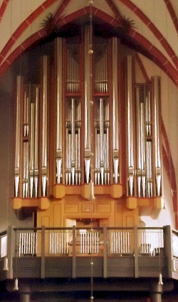 | Geschichte der Orgel: | 1977 Renovierung durch Sebald und Ersatz des dreimanualigen Spieltisches von 1936 durch einen neuen zweimanualigen Spieltisch. 1993 Abtragung des Instrumentes im Rahmen der Innenrestaurierung der Kirche.[1] Es folgte eine analoge Sakralorgel (Ahlborn) sowie eine digitale Sakralorgel (Johannus). 2007 war der Neubau durch Rieger vollendet. |