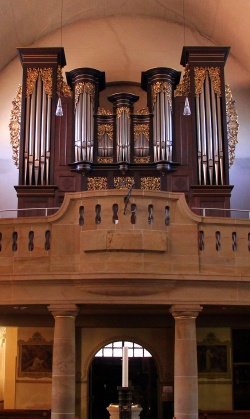 | Geschichte der Orgel: | Die Orgel wurde unter Verwendung von Pfeifen der Vorgängerorgel von Klais sowie dem Gehäuse von Stumm 1987 durch die Firma Mayer neu gebaut. |