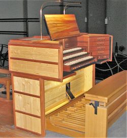 | Geschichte der Orgel: | Die Orgel wurde zunächst 2014 als Teilausbau mit Hauptwerk und Schwellwerk auf der linken Seite des Fensters erbaut. Positiv und Pedal sollen in naher Zukunft in einem rechten Gehäuse entstehen. Die Pfeifen, Windladen stammen aus einer ehemaligen Hindelang-Orgel. Der Spieltisch und das Gehäuse wurden durch die Firma Frensch neu erbaut. |