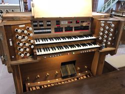 | Registeranzahl: | 14 (27) (14 "echte" Register + 7 Transmissionen + 6 Extensionen) + Rain (Regenmaschine) + Tubular Bells (Röhrenglocken, auf der Empore) + Marimba + Register von Haupt- und Pedalwerk der Hauptorgel |