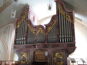 Copl 8' Spitzgambe 8' Rohrflöte 4' Gemshorn 2' Vox humana 8' Tremulant |