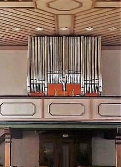 | Geschichte der Orgel: | Die Orgel wurde 2017 durch die heutige Jann-Orgel ersetzt. Sie wurde nach Süditalien verkauft und dort elektrifiziert, sonst jedoch unverändert wiederaufgestellt. |