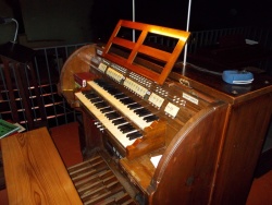 | Spielhilfen, Koppeln: | 3 Normalkoppeln, 2 freie Vorbereitungen (Kombinationen), Druckregister(*) ab, Crescendo ab, Tutti, Crescendowalze, Tremulant, Schwelltritt, Nullsteller für die "Druckregister" der Manuale durch eisernen Hebel; Fußpistons für Kombinationen, Koppeln, Tutti und Walze ab