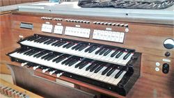 | Spielhilfen, Koppeln: | II/I, I/P, II/P, 1 freie Kombination, Tutti, Registercrescendopedal, Handregister zur freien Kombination, Handregister zum Registercrescendo, Oboe Ab |