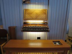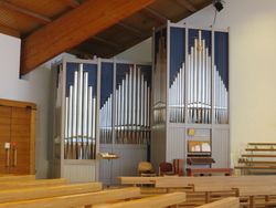 | Spielhilfen, Koppeln: | II/I, I/P, II/P. Setzeranlage (128 Speicherplätze), Sequenzer vor und zurück. Einzelabsteller für die Zungenregister, Zimbelstern (Druckknopf), Glockenspiel (noch nicht eingebaut, Druckknopf). Tutti (Piston), Zungen ab (Piston). Kombinationsschalter als Drücker unter dem I. Manual und als Pistons. Schwelltritt für II. Manual. |