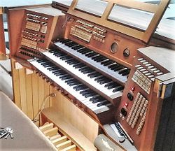 | Spielhilfen, Koppeln: | I/II, III/II, III/I, I/P, II/P, III/P, 2 freie Kombinationen, 2 freie Pedalkombinationen, Tutti, Crescendowalze, Zungeneinzelabsteller |