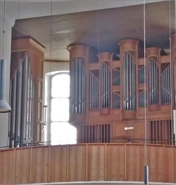 | Umbauten: | 2005 erfolgte eine Umdisponierung der Mixturen (*), Einbau einer neuen Setzeranlage und eine Neuintonation durch die Firma Johannes Führer. Die Spieltraktur des Pedals wurde dabei elektrifiziert. |