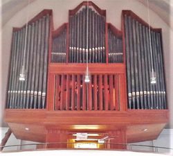 | Umbauten: | Im Dezember 2014 wurde die Orgel durch Orgelbau Rieger gereinigt und etwas umgebaut. Dabei wurde die Pedaltraktur elektrifiziert, die Hauptwerks- sowie die Pedalmixtur um 2-3 Chöre gekürzt, sowie der dreifache Septimen-Terzian im Schwellpositiv in die separaten Register Quinte 11/3' und Terz 13/5' aufgespalten und der Septimenchor stillgelegt. |