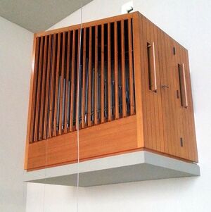 | Gehäuse: | frei aufgehängt links und rechts der Empore; Schwellwerk ohne sichtbaren Prospekt, Hauptwerk/Pedal mit chromatisch ansteigenden Prospektpfeifen z.T. aus Kupfer |