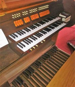 Spielhilfen, Koppeln: II/I, I/P, II/P, II/P (Super), 2 freie Kombinationen, Tutti, Zungen Ab