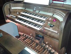 | Spielhilfen, Koppeln: | I/II, III/II, III/I, I/P, II/P, III/P, 3 freie Kombinationen, Labialtutti, Generaltutti, Crescendowalze, Zungeneinzelabsteller |