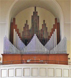 | Umbauten: | 1978 Geringe Umdisponierung durch Oberlinger. Umsetzen der Schwellwerkstrompete 8' ins Hauptwerk und Bau einer neuen Oboe 8' im Schwellwerk. Darüber hinaus wurde die Hauptwerksmixtur höhergelegt. 2012 Umbau durch Thomas Gaida, Spielbarmachung der Pedalzunge und der Hauptwerkstrompete als Auxiliar auf jeder Klaviatur. Bau eines neuen separaten Registertableaus und Restaurierung des originalen Spieltisches. |