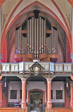 | Geschichte der Orgel: | Die Hock-Orgel wurde 1953 umgebaut und erweitert. Das Instrument wurde 1999 aufgegeben und durch die heutige Link-Orgel ersetzt. Ein Foto des Zustandes kurz vor dem Abbau 1999 findet sich hier. |