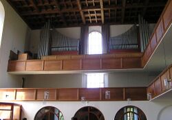| Gehäuse: | Freipfeifenprospekt in 2 Gehäuseteilen links und rechts des Emporen-Fensters |