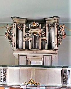 | Geschichte der Orgel: | Die Orgel wurde von Peter vier 1970 mit zwei Manualen neu erbaut. Dabei wurden das Gehäuse, sämtliche erhaltene historische Pfeifen und die Windlade der ursprünglichen Orgel von 1750 wiederverwendet. |