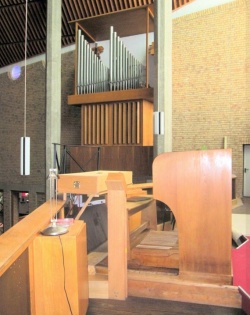 Geschichte der Orgel: Die Orgel wurde aus Kostengründen nur als Teilausbau realisiert. Zunächst wurden nur die 7 Register des Schwellwerks (III) eingebaut. 1963 folgte dann durch die Erbauerfirma Klais die Erweiterung um die Register des Hauptwerks (II). Der Gedacktpommer 16' des Hauptwerks konnte als Transmission im Pedal gespielt werden. Das geplante Positiv (I) auf der gegenüberliegenden Seite sowie ein eigenständiges Pedal wurden nie realisiert. 2014 baute die Firma Hugo Mayer die Orgel im Zuge einer Renovierung um. Der Gedacktpommer 16' des Hauptwerks wurde zum Subbass umintoniert und dem Pedal zugeordnet. Dabei wurde um 6 Pfeifen aufgerückt und die tiefsten 6 Pfeifen in entsprechender Mensur neu von Mayer ergänzt. Des Weiteren wurde das Hauptwerk um eine Octave 4' erweitert. Es wurden diverse Manual- und Oktavkoppeln zum ersten Manual eingebaut um dieses als Koppelmanual nutzen zu können.
