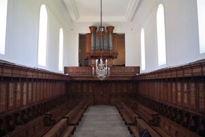 Geschichte der Orgel: Der ursprüngliche Dispositionsentwurf des zuständigen Orgelsachverständigen Albert Schweitzer im Stil der elsässischen Orgelbewegung wurde durch das College abgelehnt, dessen Vertreter eine traditionelle englisch-romantische Disposition bevorzugten. Das entstandene Instrument basiert weitgehend auf der 1934 erbauten und später um eine Mixtur ergänzten Orgel der College-Kapelle von Lady Margaret Hall.