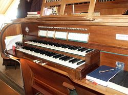 | Spielhilfen, Koppeln: | II/I, II/I (Sub), II/I (Super), I/P, II/P, 1 freie Kombination, Piano, Forte, Tutti, Zungen Ab, Crescendotritt |