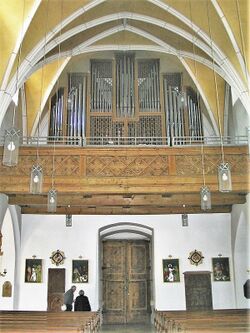 | Spielhilfen, Koppeln: | II/I, I/P, II/P, 2 freie Kombinationen, 1 freie Pedalkombination, Tutti, Crescendowalze, Zungeneinzelabsteller, Zungengeneralabsteller |