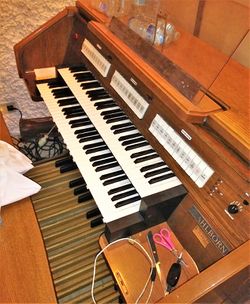 | Spielhilfen, Koppeln: | II/I, I/P, II/P, 5 Setzerkombinationen, PP, P, MF, F, FF, Plenum Hauptwerk, Plenum Schwellwerk, Tutti, Crescendotritt, Zungen Ab, A. P., Transposer +2 -4 HT |