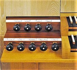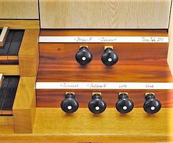 Spielhilfen, Koppeln: II/I, I/P, II/P, Tremulant (wirkt auf beide Manuale)