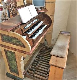 | Spielhilfen, Koppeln: | II/I, II/I (Sub), II/I (Super), I/P, II/P; Piano, Mezzoforte, Fortissimo, Automatische Pedalumschaltung, Registerabstoßer Hauptwerk, Registerabstoßer II. Manual |