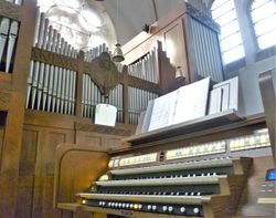 Rohrgedackt 8' Viola di Gamba 8' Vox celeste 8' Oktave 4' Gemshorn 4' Nasard 22/3' Blockflöte 2' Terz 13/5' Scharff III Fagott 16' Trompete 8' Oboe 8' Vox humana 8' Clairon 4' Tremulant |