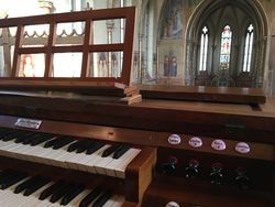 | Spielhilfen, Koppeln: | Koppeln: Manualkoppel, I-Pedal, II-Pedal, Feste Kombinationen: Pleno, Forte, Piano, Handregister; |