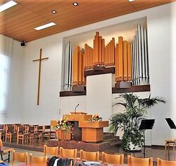 | Umbauten: | 2021 Erneuerung der Elektrik mit Einbau einer Suboktavkoppel II/I sowie einer 1000fachen Setzeranlage anstatt der festen Kombinationen. Das Register Basson 8' ist nun auch vom II. Manual aus spielbar. |