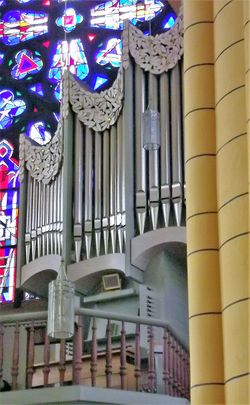 | Gehäuse: | Dreiteilig, Pedal links, Hauptwerk rechts, davor Rückpositiv |