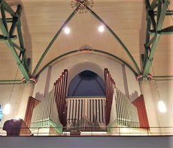 Umbauten: 1993 erfolgte eine Sanierung der Orgel nach einer Umgestaltung des Kircheninnern durch Vleugels. Gemshorn und Salicional tauschten ihren Standort in den Teilwerken