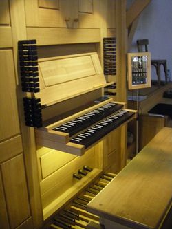 | Spielhilfen, Koppeln: | Koppeln II-I, I-P, II-P als Tritte, Tremulant stark, Tramulant sanft, Zimbelstern |