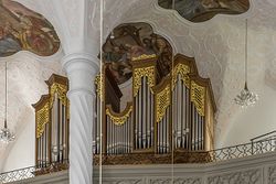 Bourdon 8' Gamba 8' Voix celeste 8' Octav 4' Flute traverse 4' Nazard 22/3' Doublette 2' Tierce 13/5' Plein jeu 2' (4-fach) Hautbois 8' Tremulant |