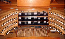 Geigenprincipal 8' Konzertflöte 8' Gamba 8' Salicional 8' Vox coelestis 8' [6] Fugara 4' Traversflöte 4' Piccolo 2' Cornett 3-4f Scharff 5f [7] Tuba mirabilis 8' Oboe 8' Clairon 4' [8] Tremulant |