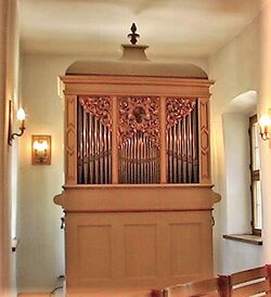 | Geschichte der Orgel: | Im Jahre 1936 wurde ein beinahe vollständig zerstörtes Barockpositiv aus Nothgottes im Rheingau durch die Firma Steinmeyer rekonstruiert. Es handelt sich faktisch um einen Nachbau, welcher sich solch großer Beliebtheit erfreute, dass in den 1950er Jahren weitere baugleiche Instrumente von Steinmeyer erbaut wurden. |