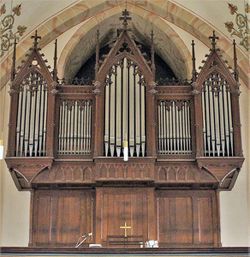 | Geschichte der Orgel: | Die Orgel wurde unter Verwendung von großen Teilen der Voit-Orgel von 1902 technisch neu erbaut. Wiederverwendet wurden zahlreiche Register, sowie das historische Gehäuse aus dem Jahr 1902. |