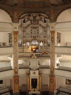 1722: Für den fast fertiggestellten Kirchenneubau wird eine Orgel bei Trost in Auftrag gegeben. 1724: Die Arbeiten an der Orgel beginnen. 1730: Trost reist ab, ohne die Orgel vollendet zu haben. Durch die Zahlungsschwierigkeiten der Stadt beim Bau der Orgel sowie durch die geringe Rücksichtnahme auf den Orgelbau scheint es Trost schließlich unmöglich gewesen zu sein, die Orgel zu vollenden. Allerdings hatte er wohl keinen geringen Anteil an der verfahrenen Situation. Der Bürgermeister Marci dichtete über den „liederlichen Orgelmacher Trost“: „Vor gethan und nach bedacht, hat manchen, und auch Uns bey diesem gantzen Kirch-Bau, in viel Leid und Unglück bracht. Der Orgelmacher heisst zwahr Trost, doch giebt Er uns gar schlechten Trost, Ach weren wir vom Trost erlost.“ 1755: Die Orgel wird von verschiedenen Orgelbauern vervollständigt. 1835-55: Umbauten und Reparaturen durch Johann Michael Hesse (Dachwig), u.a. Höherstimmung. 1896/97: Einbau einer neuen Windanlage durch Hugo Böhm. 1958-59: Instandsetzung, u.a. Einbau einer neuen Windanlage und Austausch von Registern durch Firma Hermann Eule (Bautzen). 1993: Vertrag über eine Restaurierung mit der Firma Orgelbau Waltershausen. 1995-98: Vollständige Restaurierung der Orgel auf den ursprünglichen Zustand durch die Orgelbaugesellschaft Waltershausen. Die Disposition mit vielen achtfüßigen und engmensurierten Registern zeigt, dass es sich um ein typisches mitteldeutsches Instrument des 18. Jahrhunderts handelt. Andererseits weist sie eine Reihe von Besonderheiten auf. Heute sind noch ca. 70 % der Originalsubstanz vorhanden.Quelle |