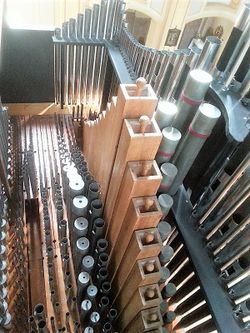 | Geschichte der Orgel: | Die Orgel wurde 1982 durch die Erbauerfirma auf 42 Register erweitert, dabei bekam auch das Brüstungspositiv eine neue Schleiflade. 2015 wurden die Prospektpfeifen dann durch Göckel erneuert und auch der Spieltisch umgebaut und komplett erneuert. Die freien Kombinationen wurden durch eine Setzeranlage ausgetauscht. Darüber hinaus wurde die Manualbelegung geändert; das Hauptwerk spielt sich nun vom ersten, das Brüstungspositiv vom zweiten Manual. Im Schwellwerk wurde eine Schwebung 8' eingebaut und im Hauptwerk eine Sub- und Superkoppel I/I ergänzt. |