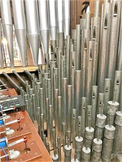 | Umbauten: | In den 1960er Jahren fand eine Neobarockisierung der Disposition und Elektrifizierung der Traktur statt. 2019 wurde die Disposition durch Orgelbau Romanus Seifert rekonstruiert, die elektrische Traktur allerdings beibehalten und eine Setzeranlage eingebaut. |