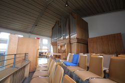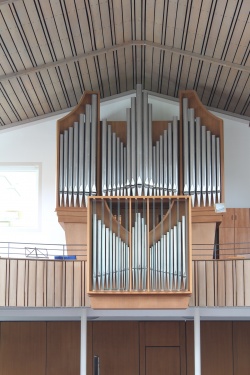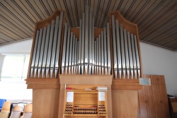 | Umbauten: | 1983 wurde die Orgel vom Erbauer von 18 auf 21 Register erweitert. Es kamen hinzu: Koppelflöte 4' im Hw., Sesquialter 2f mit Vorabzug Terz 1 3/5' im Pos. und Pommer 8' im Pedal. Das Pos. wurde mit Plexiglasjalousien schwellbar eingerichtet. Gleichzeitig wurde die Traktur umgehängt. Seither ist das Hw. von II, das Pos. von I. zu spielen. Die Koppelmechanik wurde nicht verändert, so dass Hw. an Rückpos. koppelt. |