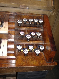 Viola di Gamba 8' Gedackt 8' Trompete 8' Tibia 8' Traversflöte 4' Oktav 4' Quinte 22/3' Oktav 2' Mixtur 22/3' |