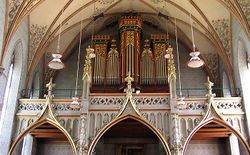 | Spielhilfen, Koppeln: | 6fache Setzanlage und Organo Pleno; 6 Normalkoppeln wechselwirkend mit Zügen und Tritten; Crescendo, Absteller für Zungen |