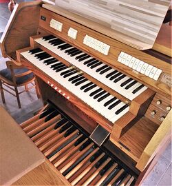| Spielhilfen, Koppeln: | II/I, I/P, II/P, 5 Kombinationen, Transposer +2 -3 HT |